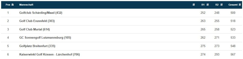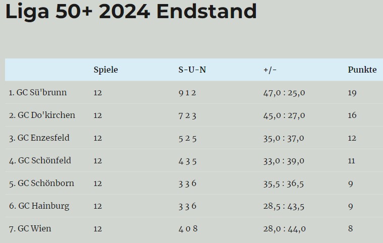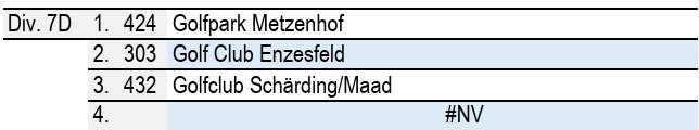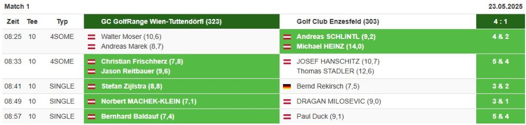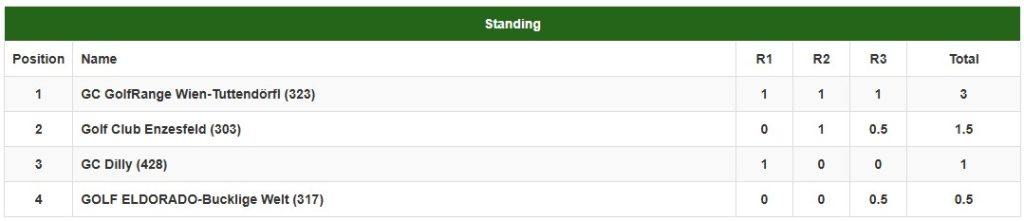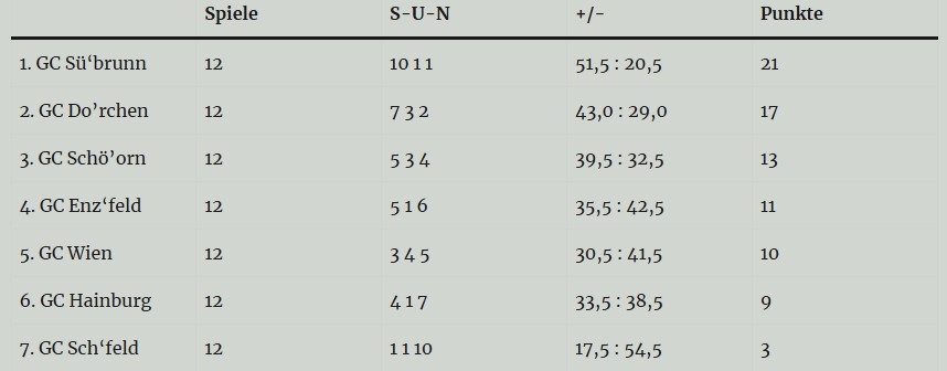Da aber zur gleichen Zeit der GC Amstetten gegen den GC Poysdorf mit 4:1 gewann, wurden sie, wie aus der Abschlusstabelle ersichtlich ist (Regel 2) mit einem Spielgewinn mehr (9,5 gegen 8,5 gewonnen Löcher) Sieger dieser Gruppe.