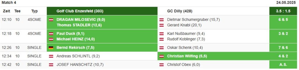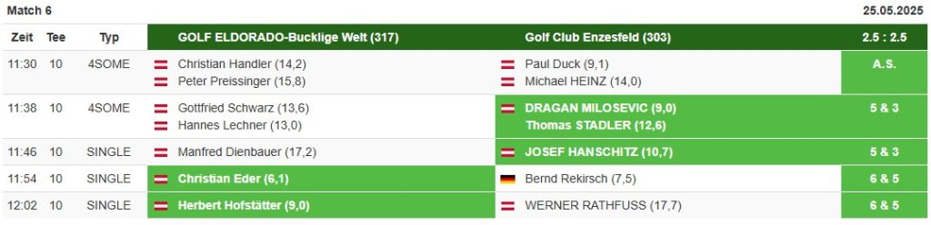 Da wir alle unsere Spiele während dieser Meisterschaft von der Spielbahn 10 beginnen mussten, sprach der Zwischenstand nach den „ersten Neun“ klar für den GC Amstetten. Sie führten in den ersten 3 Begegnung recht klar. Dies sollte sich jedoch auf den „zweiten Neun“ ändern. Nachdem unser erster 4Some nach 15 gespielten Löchern 3 down war, gelang noch ein zu diesem Zeitpunkt nicht mehr erwartetes All Square.